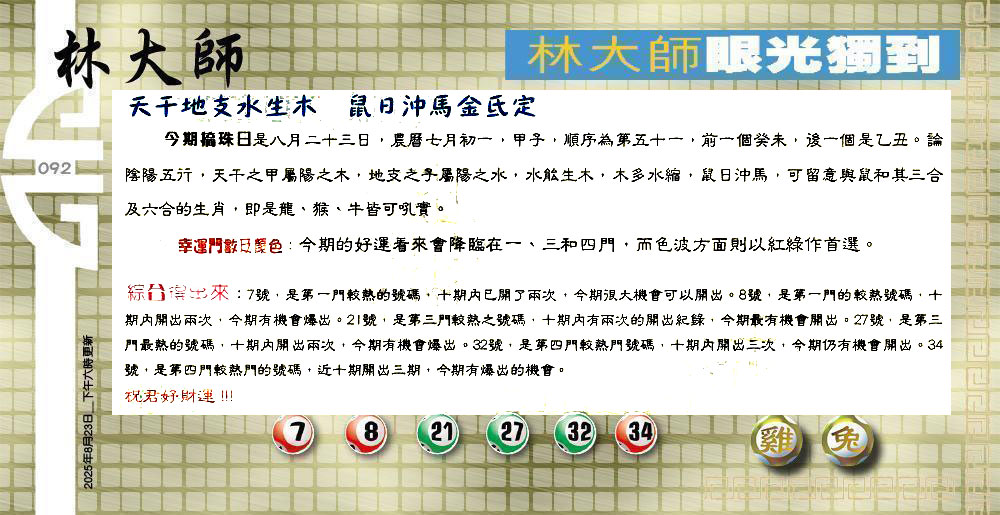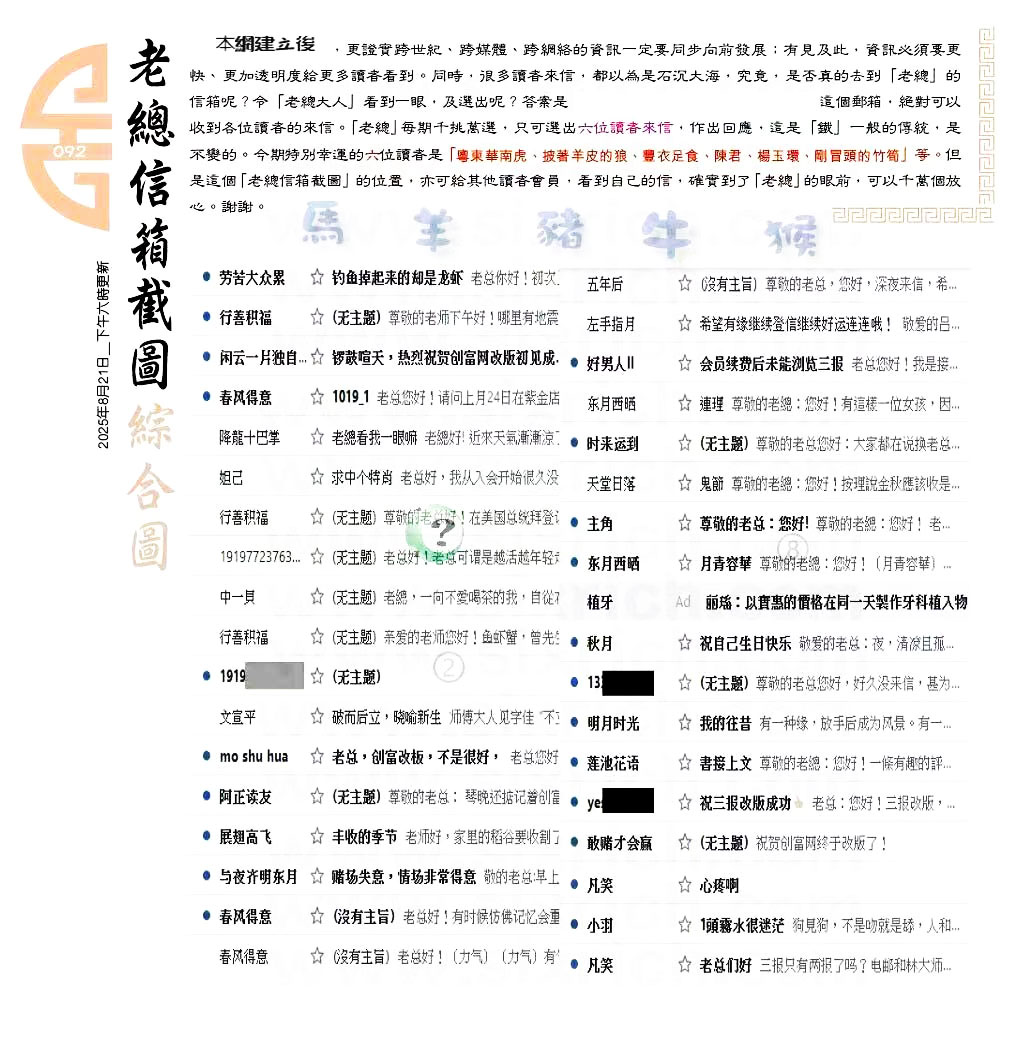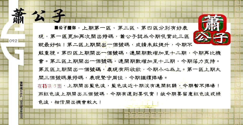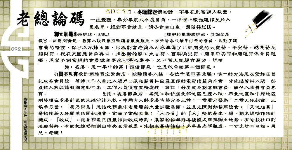 主题 :092期:六合皇金句/老总论码/萧公子/林大师/五行夺码/老总信箱截 |