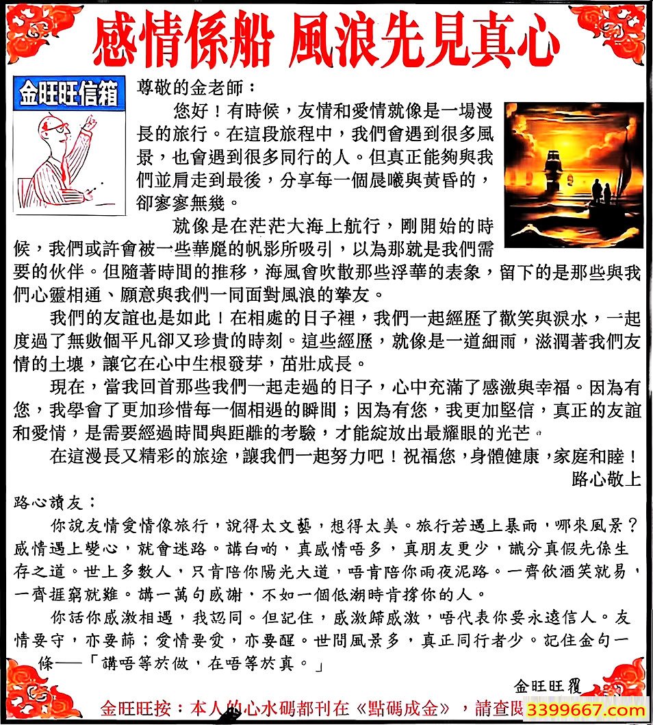 095期:金旺旺信箱彩民推荐→→《感情係船 風浪先見真心》