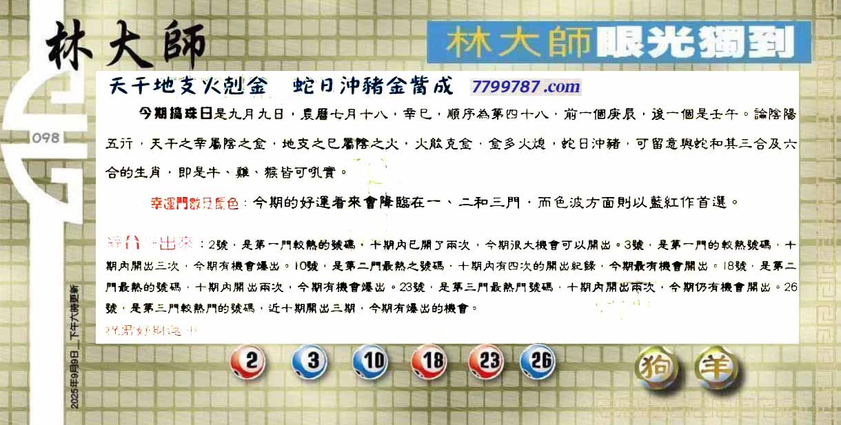 主题 :098期:六合皇金句/老总论码/萧公子/林大师/五行夺码/老总信箱截 |