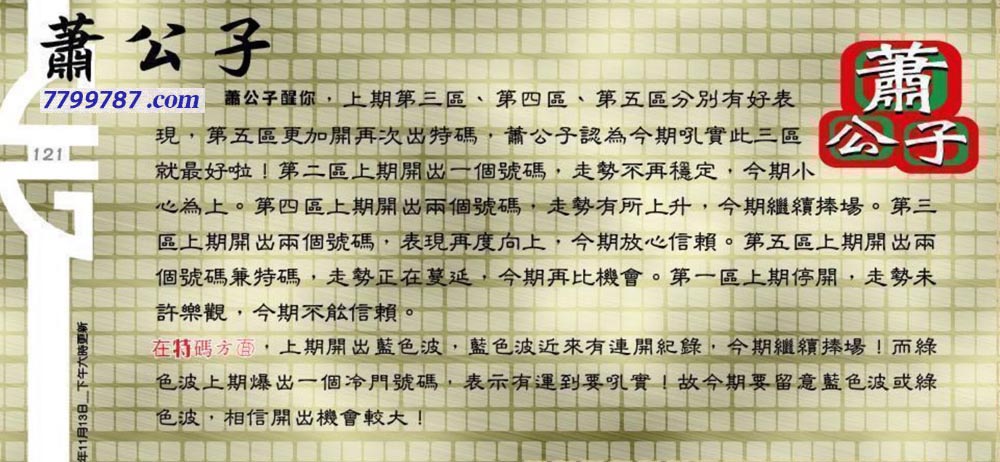 | 主题 :121期:六合皇金句/老总论码/萧公子/林大师/五行夺码/老总信箱截 |