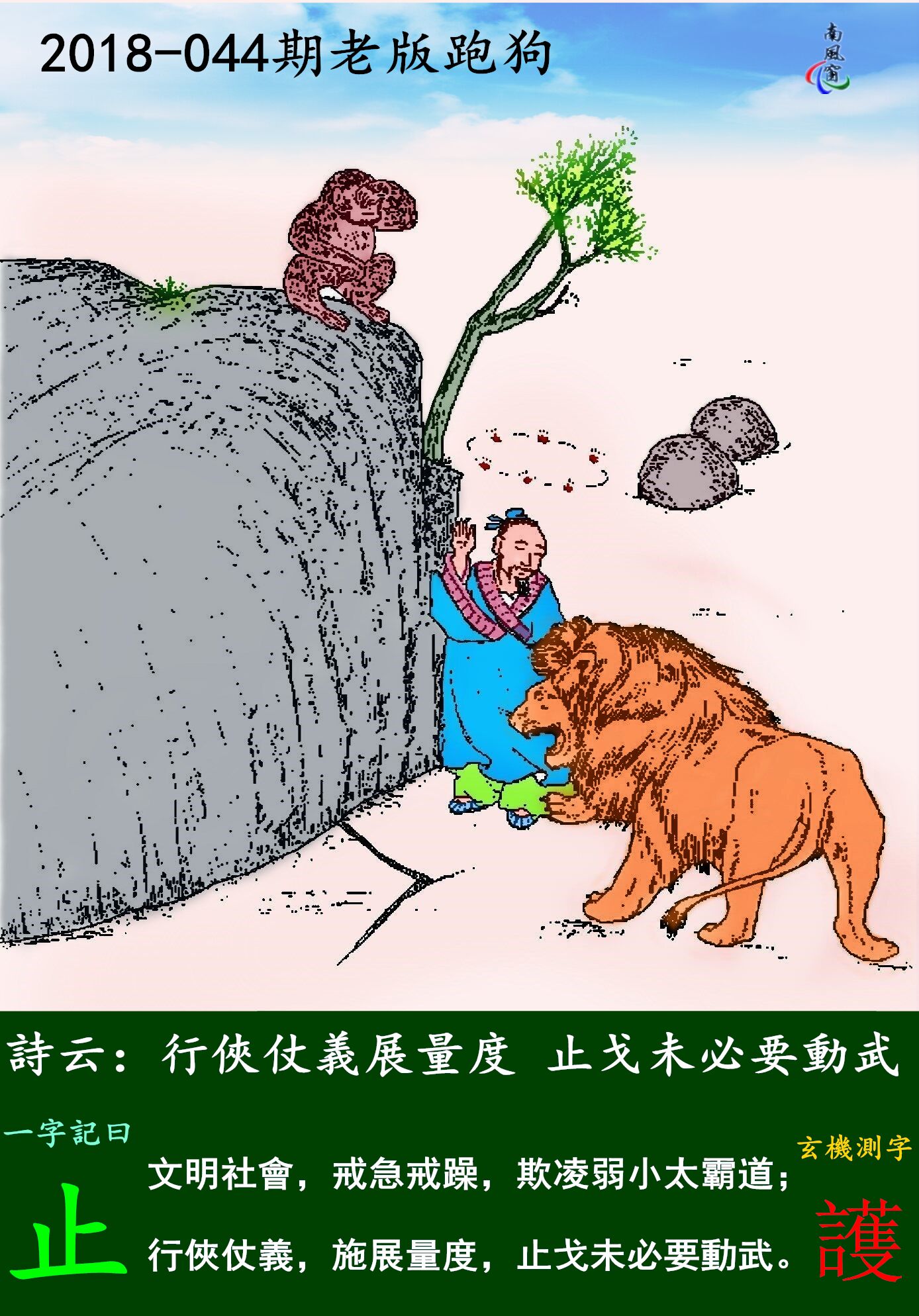 分析:可看图中猴子、男子、狮子。文明社會,戒急戒躁,欺凌弱小太霸道;欺凌弱小,这个说的是狮子,弱小,应该指的是猴子。行俠仗義,施展量度,止戈未必要動武。因为能够行侠仗义的只能够是男子。因为是文明社会,大家和平相处,以礼相待。男子行侠仗义,就要施展量度,让狮子臣服。止戈未必要動武,说明像要让狮子臣服,不一定要以暴制暴,以暴制暴有时候只能是适得其反。以柔克刚方为上策。