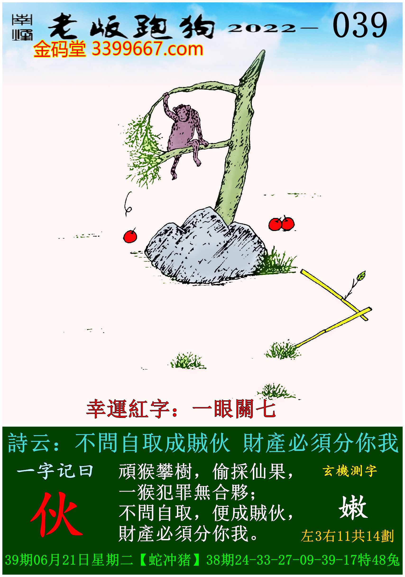 039期老版跑狗一字記之曰:【伙】玄機測字:《嫩》