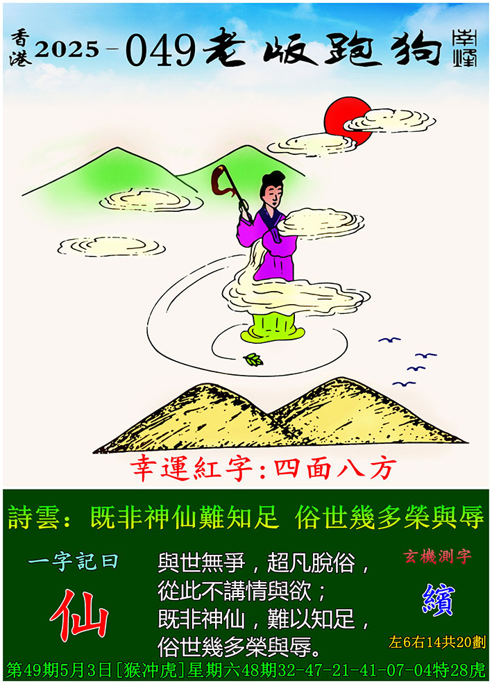 049期老版跑狗一字記之曰:【仙】
