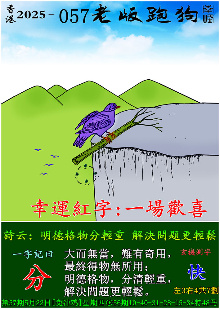 主题 : 057期老版跑狗一字記之曰:【分】 玄機測字:《快》