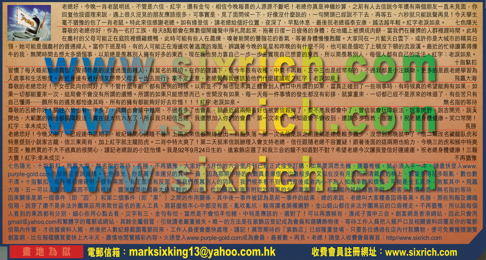 【5】尊敬的呂總你好!關註六信也有一年多了,偶爾也會猜中幾期,不過看多了也會亂,就最近這兩期看好也被曾信殺掉了,要不然我都會中了,曾信就會玩障眼法,說家開野,說吉開兇,說天開地,大範圍的肖他都搞障眼法,實在是太坑六友了,所以我只相信呂總,我還想加入你們的會員,第一次來信,不知道會不會收到,還請多多指教,謝謝! 祝老總身體健康。笑口常開!紅字:幸未成災     ---長勝