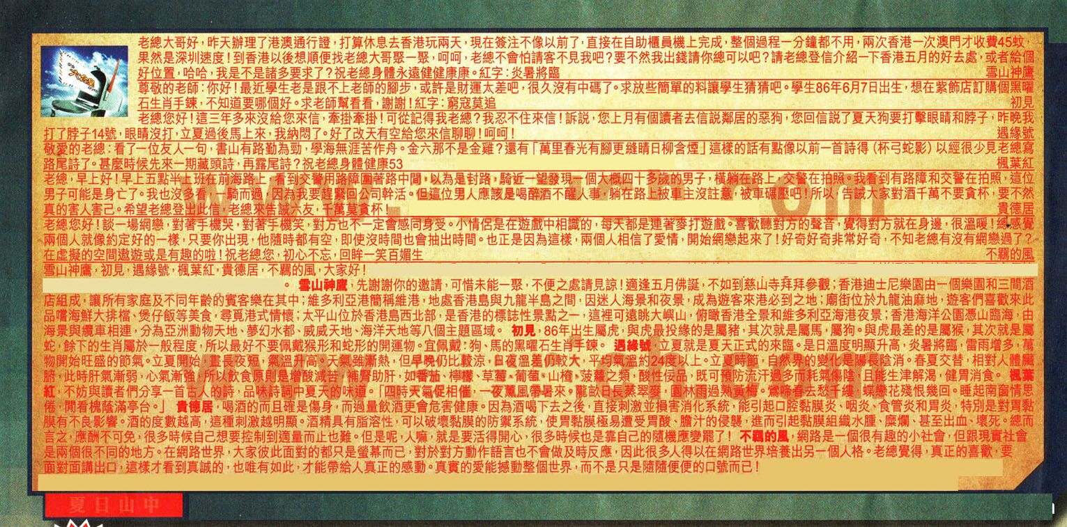 【1】老總大哥好,昨天辦理了港澳通行證,打算休息去香港玩兩天,現在簽注不像以前了,直接在自助櫃員機上完成,整個過程一分鐘都不用,兩次香港一次澳門才收費45蚊,果然是深圳速度!到香港以後想順便找老總大哥聚聚,呵呵,老總不會怕請客不見我吧?要不然我出錢請你總可以吧?請老總登信介紹一下香港五月的好去處,或者給個好位置,哈哈,我是不是諸多要求了?祝老總身體永遠健健康康。紅字:炎暑將臨 ---雪山神鹰