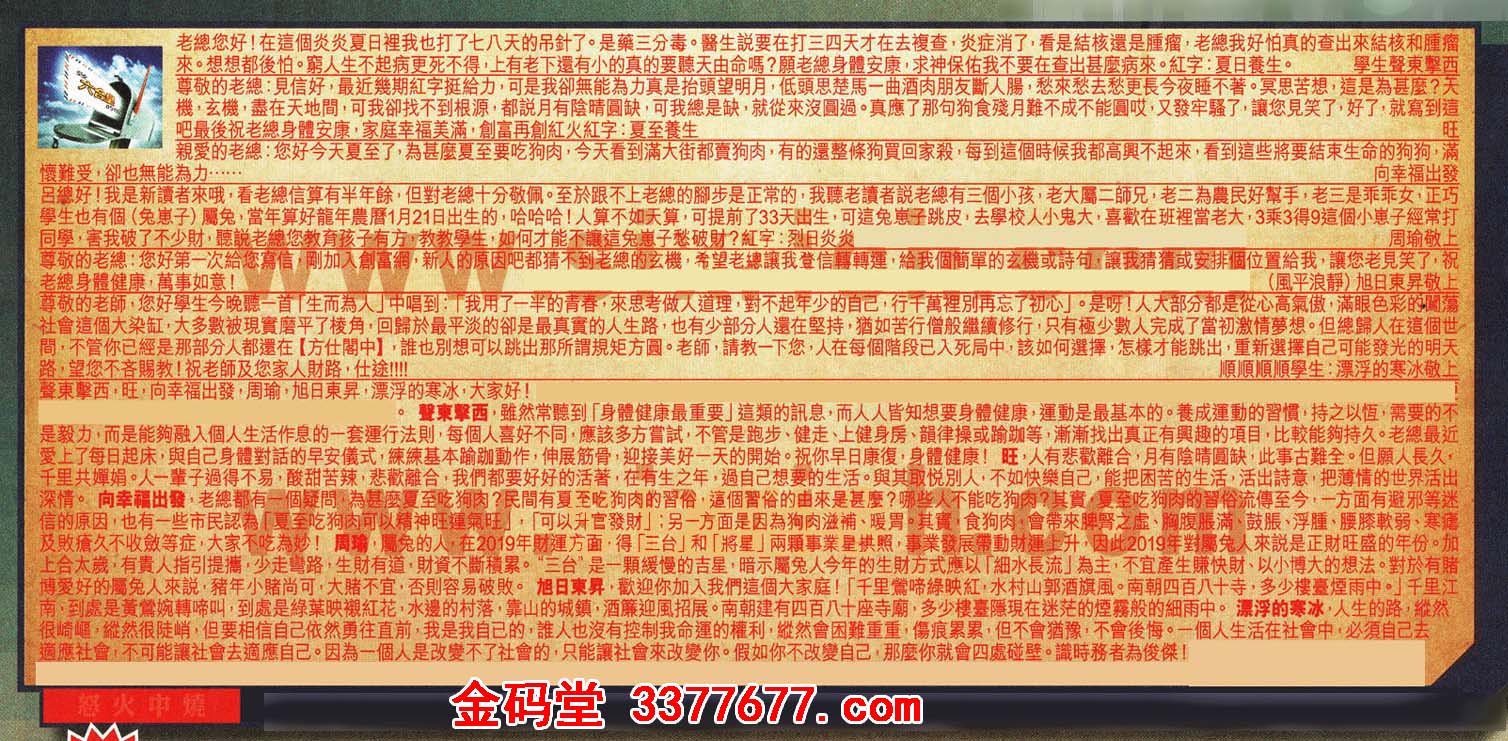 【2】尊敬的老總:見信好,最近幾期紅字挺給力,可是我卻無能為力真是抬頭望明月,低頭思楚馬一曲酒肉朋友斷人腸,愁來愁去愁更長今夜睡不著。冥思苦想,這是為甚麼?天機,玄機,盡在天地間,可我卻找不到根源,都說月有陰晴圓缺,可我總是缺,就從來沒圓過0真應了那句狗食殘月難不成不能圓哎,又發牢騷了,讓您見笑了,好了,就寫到這吧最後祝老總身體安康,家庭幸福美滿,創富再創紅火紅字:夏至養生 ---旺