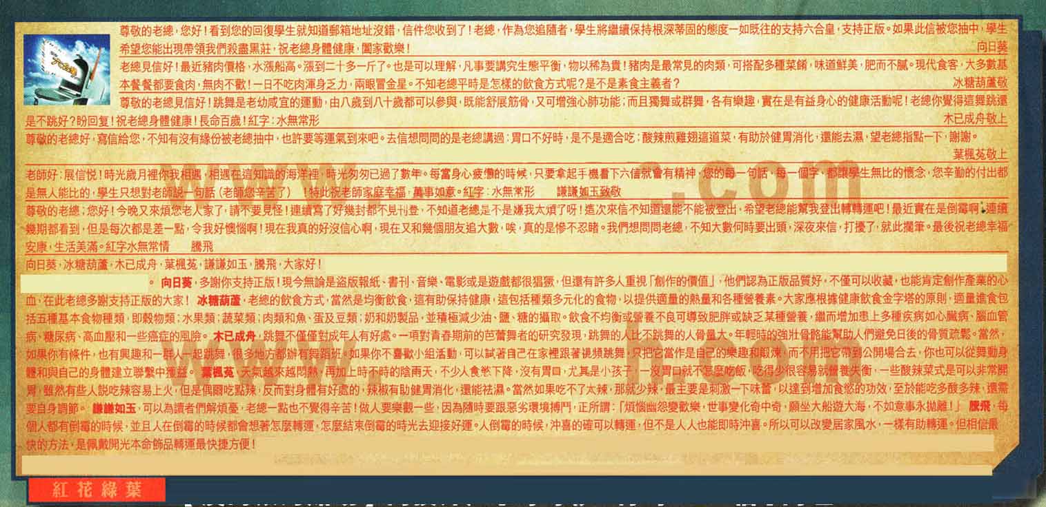 【1】尊敬的老總,您好!看到您的回復學生就知道郵箱地址沒錯,信件您收到了!老總,作為您追随者,學生將繼續保持根深蒂固的態度一如既往的支持六合皇,支持正版。如果此信被您抽中學生希望您能出現帶領我們殺盡黑莊,祝老總身體健康.闔家歡樂!---向日葵