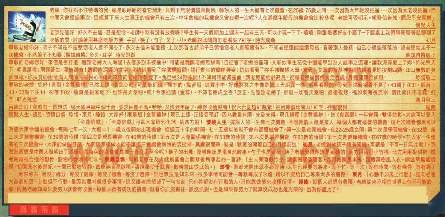 【5】.尊敬的老總:您好!看到(金尊貔貅)已然上線,很是心動。可是最近也不知怎的,點背到,總買不中,好像冥冥之中像是被上天詛咒一樣,明明看好的,等到下注時卻看不見了。43期下注31,卻落下43。02期下注14,卻落下02,這真是對著乾了,也許是天意吧。哎!今想迎請(金尊),不知老總成全否?反正,先謝謝老總了,那就一切看天意吧!最後祝您,福如東海長流水,壽比南山不老鬆!紅字:時光飛逝    東月敬上
