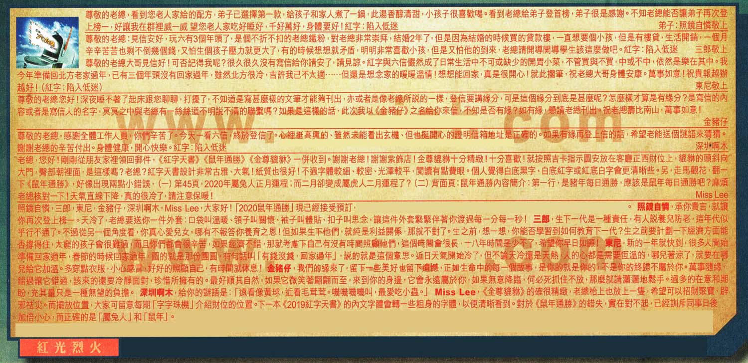 【3】.尊敬的老總大哥見信好!可否記得我呢?很久很久沒有寫信給你請安了,請見諒。紅字與六信儼然成了日常生活中不可或缺少的開胃小菜,不管買與不買,中或不中,依然是樂在其中。我今年準備回北方老家過年,已有三個年頭沒有回家過年,雖然北方很冷,吉許我已不太適……但還是想念家的暖暖溫情!想想能回家,真是很開心!就此擱筆,祝老總大哥身體安康。萬事如意!祝貴報越辦越好!(紅字:陷入低迷)    東尼敬上
