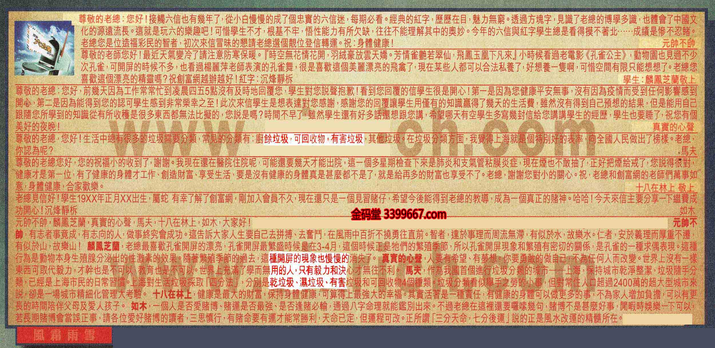 【1】.尊敬的老總:您好!接觸六信也有幾年了,從小白慢慢的成了個忠實的六信迷,每期必看。經典的紅字,歷歷在目,魅力無窮。透過方塊字,見識了老總的博學多識,也體會了中國文化的源遠流長。這就是玩六的樂趣吧!可惜學生不才,根基不牢,悟性能力有所欠缺, 往往不能理解其中的奧妙。今年的六信與紅字學生總是看得摸不著北......成績是慘不忍睹。老總您是位造福彩民的智者,初次來信冒昧的懇請老總選個靚位登信轉運。祝:身體健康!  元帥不帥