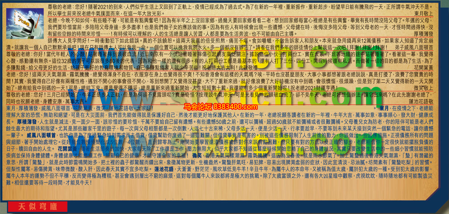 【5】.老總,您好!這兩天天氣潮濕,霧氣騰騰,總覺得渾身不自在,衣服穿在身上也覺得很不爽!不知香港會有這樣的天氣嗎?唉,平時也沒甚麼朋友,大事小事都想著跟老總說說,真是打擾了,浪費了您寶貴的時間!其實,我覺得自己好像有兩種性格,遇到不開心的事會很不開心,等到想開了又覺得沒甚麼,大不了重新來過,就好像浪費了大好時機沒有中到碼,會很懊惱,很煩躁,但是到了第二天又覺得新的一天又開始了,總有給我中到碼的一天!可是,總結下來,還是覺得不穩妥,總是重新來過重新開始,大生短短數十載,我還能有多少個重新開始呢!祝老總2021財運亨通!  微笑敬上