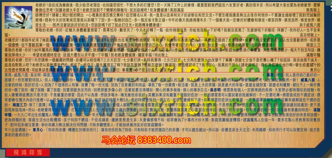 【1】.老總好!自從成為會員後,很少給您老寫信,也知道您很忙,不想太多的打擾您!您一天除了工作上的事情,還要面對我們這些六友愛好者,真的很辛苦,所以希望大家也要為老總著想,要學會換位思考!別讓老總太辛苦!老總您說對不?簡單的聊幾句,就到這裡吧!祝身體健康!高朋滿座 黑馬敬上
