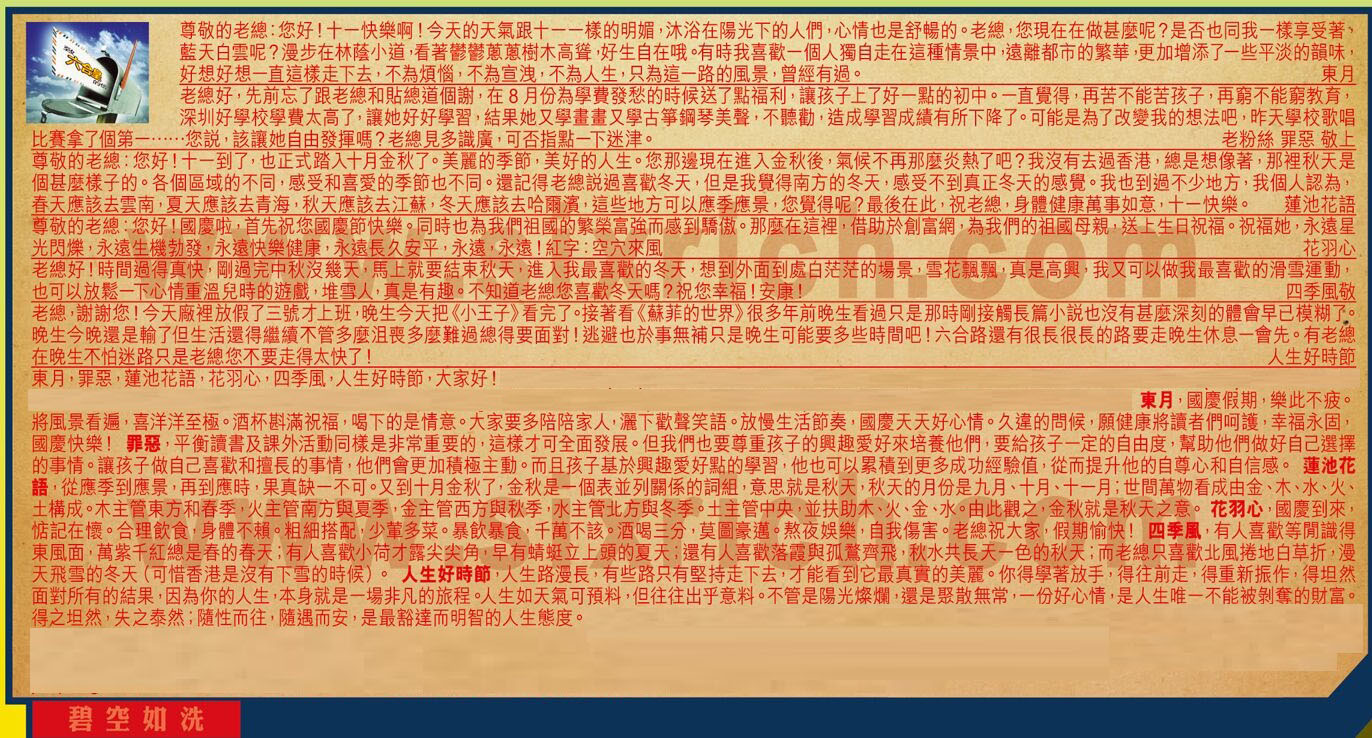 【3】.尊敬的老總:您好!十一到了,也正式踏入十月金秋了。美麗的季節,美好的人生。您那邊現在進入金秋後,氣候不再那麼炎熱了吧?我沒有去過香港,總是想像著,那裡秋天是個甚麼樣子的。各個區域的不同,感受和喜愛的季節也不同。還記得老總説過喜歡冬天,但是我覺得南方的冬天,感受不到真正冬天的感覺。我也到過不少地方,我個人認為,春天應該去雲南,夏天應該去青海,秋天應該去江蘇,冬天應該去哈爾濱,這些地方可以應季應景,您覺得呢?最後在此,祝老總,身體健康萬事如意,十一快樂。  蓮池花語
