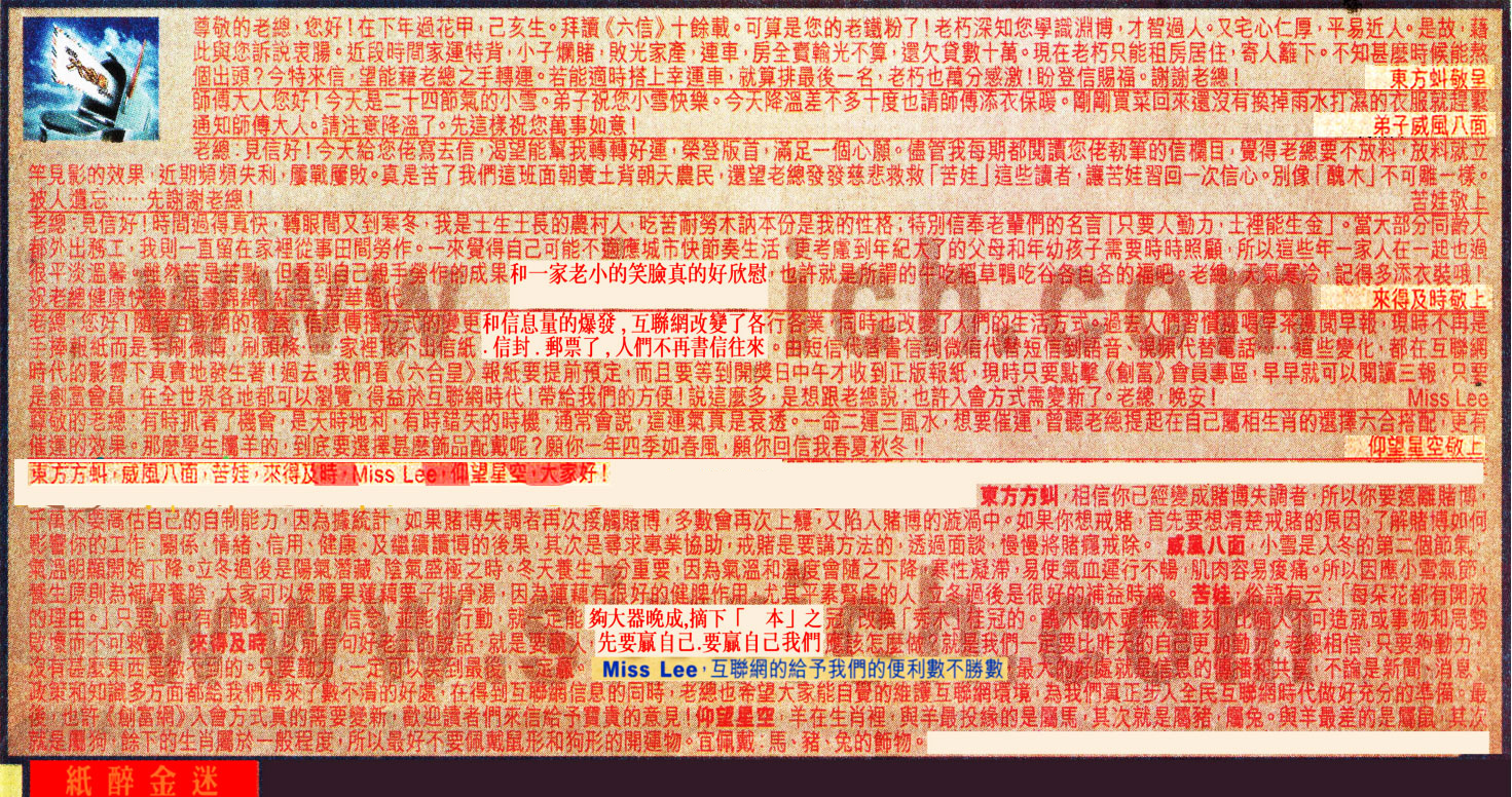 3. 老總:見信好!今天給您佬寫去信,渴望能幫我轉轉好運,榮登版首,滿足一個心願。儘管我每期都閲讀您佬執筆的信欄目,覺得老總要不放料,放料就立竿見影的效果,近期頻頻失利,屢戰屢敗。真是苦了我們這班面朝黃土背朝天農民,還望老總發發慈悲救救「苦娃」這些讀者,讓苦娃習回一次信心。別像「醜木」不可雕一樣。被人遺忘......先謝謝老總! 苦娃敬上