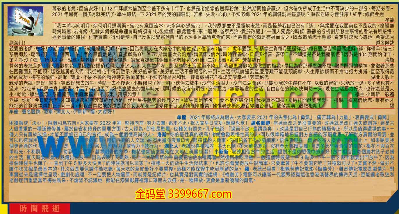 【1】.尊敬的老總:展信安好!自12年拜讀六信到至今差不多有十年了,也算是老總您的鐵桿粉絲。雖然期間輸多赢少,但六信彷彿成了生活中不可缺少的一部分,每期必看。2021年還有一個多月就完結了,學生總結一下2021年的我的關鍵詞:苦累,失敗,心酸。不知老總2021年的關鍵詞是甚麼呢?順祝老總身體健康! 紅字:紙醉金迷  牟龍