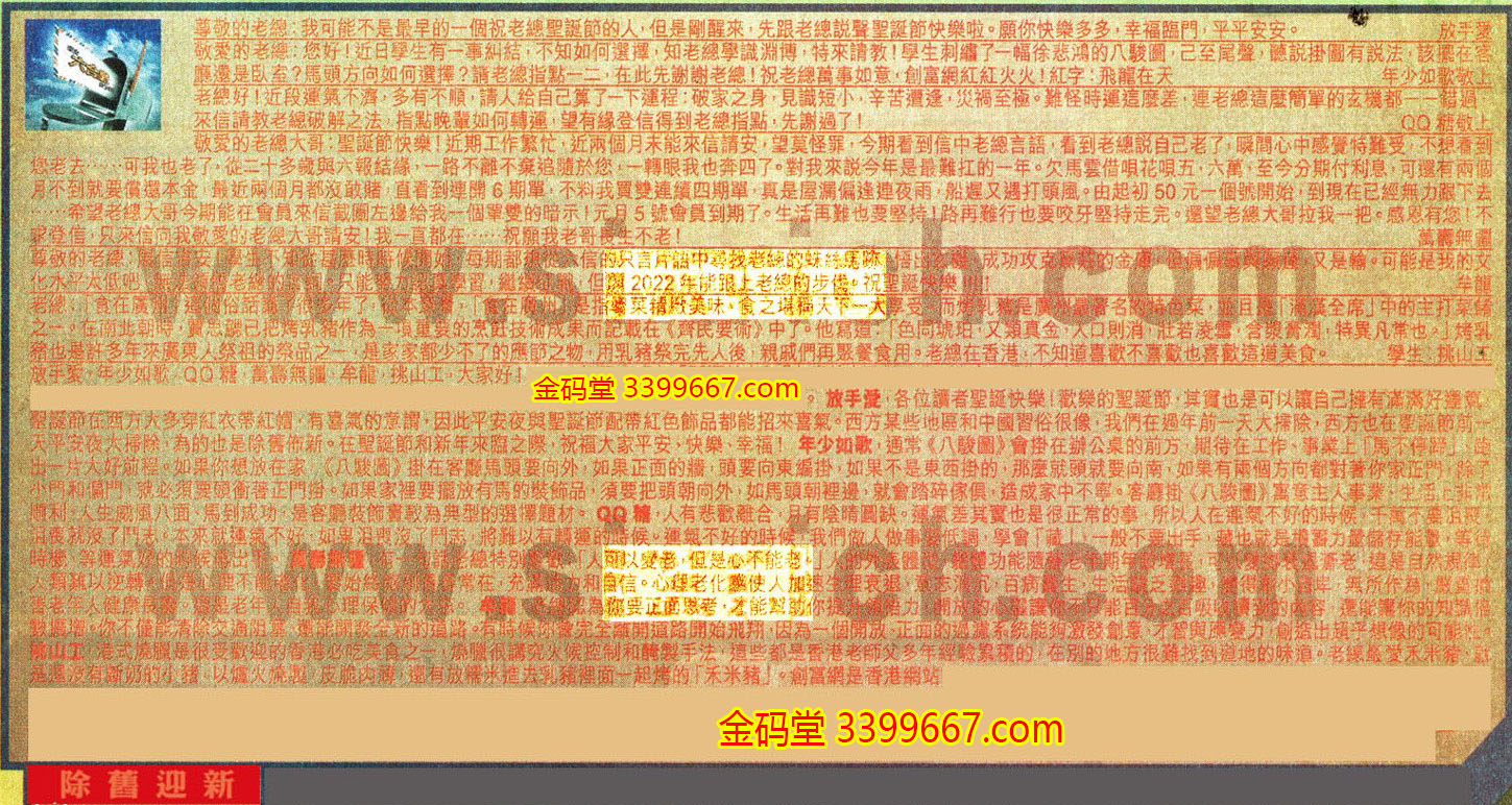 【4】. 敬愛的老總大哥:聖誕節快樂!近期工作繁忙,近兩個月未能來信請安,望莫怪罪,今期看到信中老總言語,看到老總説自己老了,瞬間心中感覺特難受,不想看到您老去······可我也老了,從二十多歲與六報結緣,一路不離不棄追隨於您,一轉眼我也奔四了。對我來説今年是最難扛的一年。欠馬雲借唄花唄五,六萬,至今分期付利息,可還有兩個月不到就要償還本金,最近兩個月都沒敢賭,直看到連開6期單,不料我買雙連續四期單,真是屋漏偏逢連夜雨,船遲又遇打頭風。由起初50元一個號碼開始,到現在已經無力跟下去······希望老總大哥今期能在會員來信截圖左邊給我一個單雙的暗示!元月5號會員到期了。生活再難也要堅持!路再難行也要咬牙堅持走完。還望老總大哥拉我一把。感恩有您!不求登信,只來信向我敬愛的老總大哥請安!我一直都在······祝願我老哥長生不老!  萬壽無疆