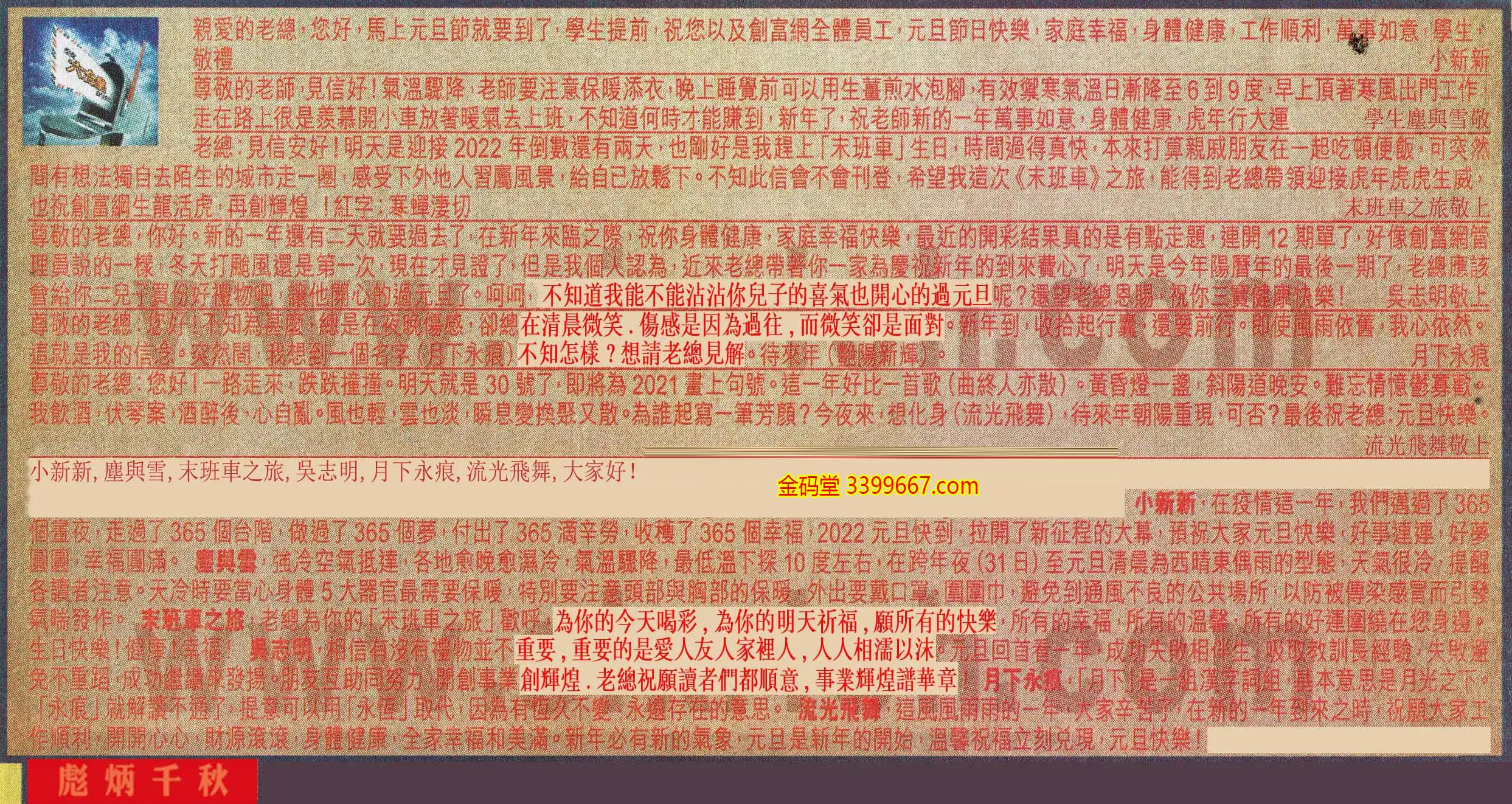 【3】. 老總:見信安好!明天是迎接2022年倒數還有兩天,也剛好是我趕上「末班車」生日,時間過得真快,本来打算親戚朋友在一起吃頓便飯,可突然間有想法獨自去陌生的城市走一圈,感受下外地人習屬風景,給自己放鬆下。不知此信會不會刊登,希望我這次《末班車》之旅,能得到老總帶領迎接虎年虎虎生威,也祝創富網生龍活虎,再創輝煌!紅字:寒蟬淒切  末班車之旅敬上