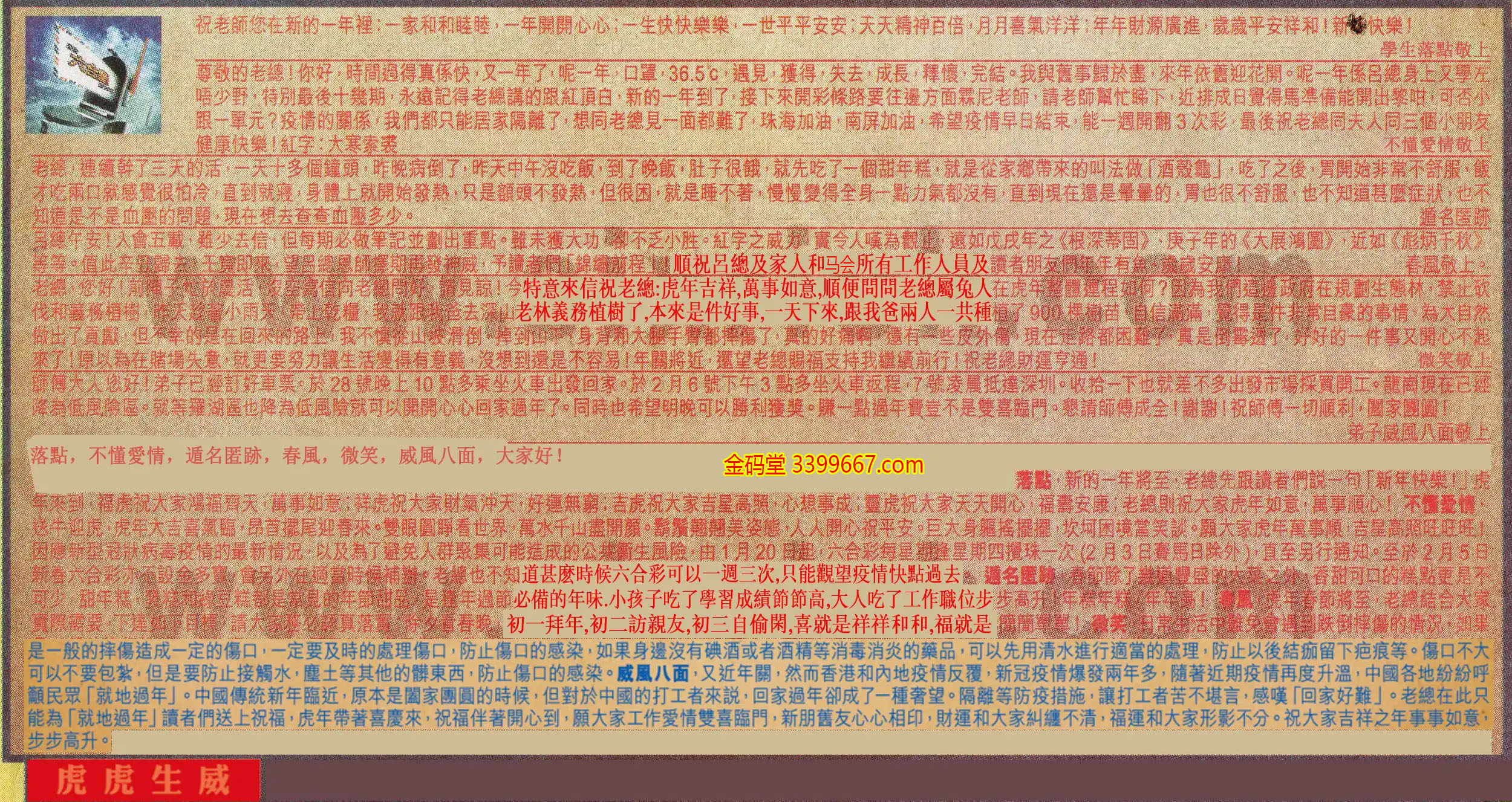 →〖威風八面〗:又近年關,然而香港和内地疫情反覆,新冠疫情爆發兩年多,隨著近期疫情再度升溫,中國各地紛紛呼籲民衆「就地過年」。中國傳統新年臨近,原本是闔家團圓的時候,但對於中國的打工者來說,回家過年卻成了一種奢望。隔離等防疫措施,讓打工者苦不堪言,感嘆「回家好難」。老總在此只能為「就地過年」讀者們送上祝福,虎年帶著喜慶來,祝福伴著開心到,願大家工作愛情雙喜臨門,新朋舊友心心相印,財運和大家糾纏不清,福運和大家形影不分。祝大家吉祥之年事事如意,步步高升。