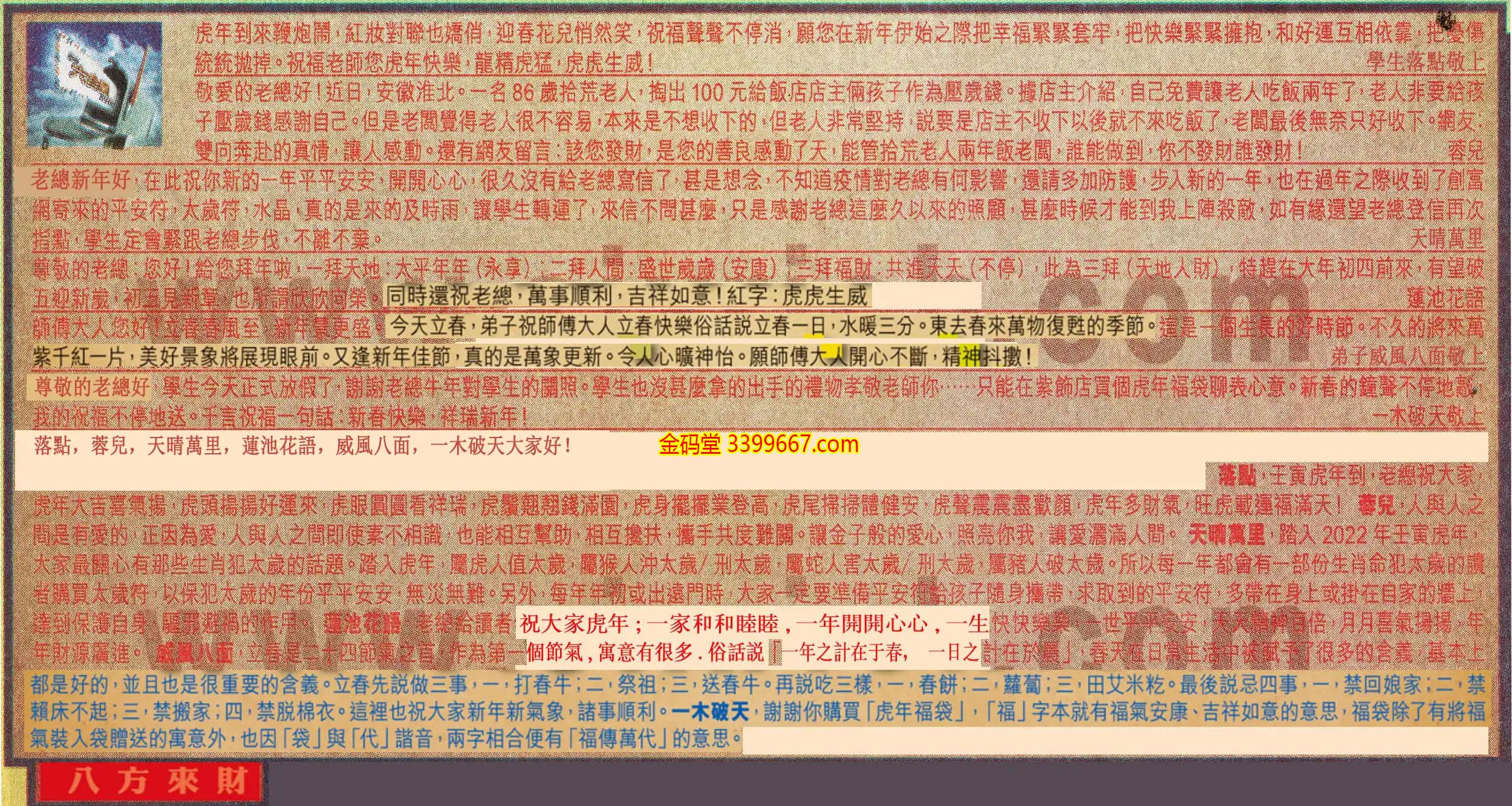 →〖落點〗:壬寅虎年到,老總祝大家,虎年大吉喜氣揚,虎頭揚揚好運來,虎眼圓圓看祥瑞,虎鬚翹翹錢滿園,虎身擺擺業登高,虎尾掃掃體健安,虎聲震震盡歡顏,虎年多財氣,旺虎載運福滿天!