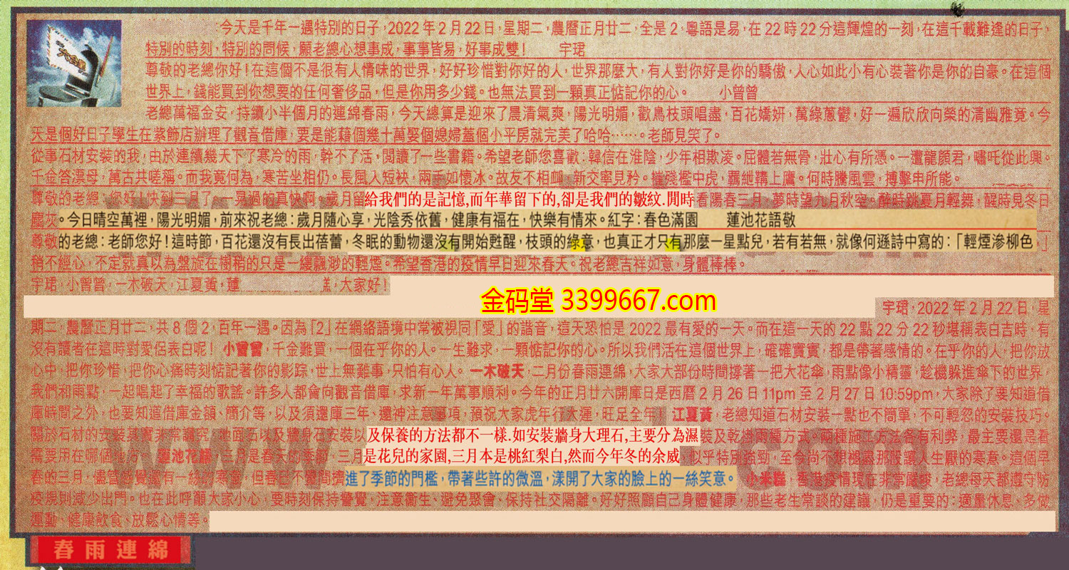 【1】. 尊敬的老總:今天是千年一遇特別的日子,2022年2月22日,星期二,農曆正月廿二,全是2,粤語是易,在22時22分這輝煌的一刻,在這千載難逢的日子,特別的時刻,特別的問候,願老總心想事成,事事皆易,好事成雙! 宇珺
