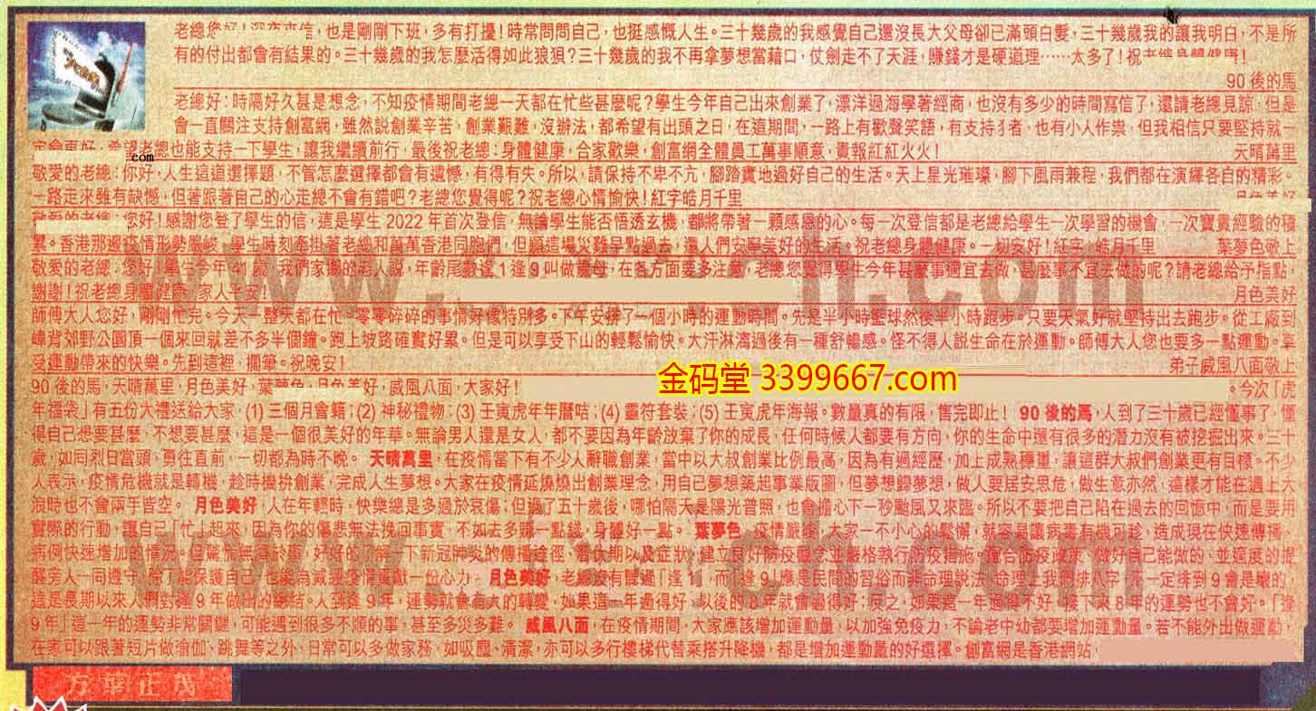 【4】.敬愛的老總:您好!感謝您登了學生的信,這是學生2022年首次登信,無論學生能否悟透玄機,都將帶著一顆感恩的心。每一次登信都是老總給學生一次學習的機會,一次寶贵經驗的積累。香港那邊疫情形勢嚴峻,學生時刻牽挂著老總和萬萬香港同胞們,但願這場災難早點過去,還人們安寧美好的生活。祝老總身體健康。一切安好!紅字:皓月千里 葉夢色敬上