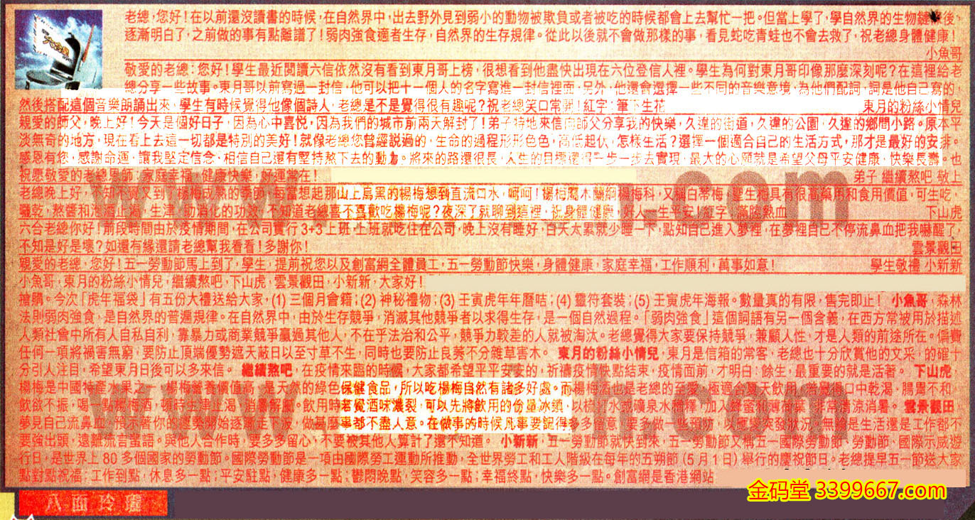 【2】.敬爱的老總:您好!學生最近閱讀六信依然沒有看到東月哥上榜,很想看到他盡快出現在六位登信人裡。學生為何對東月哥印像那麼深刻呢?在這裡給老總分享一些故事東月哥以前寫過一封信,他可以把十一個人的名字寫進封信裡面 ,另外 ,他還會選擇一些不同的音樂意境 ,為他們配詞 ,詞是他自己寫的,然後搭配這個音樂朗誦出來,學生有時候覺得他像個詩人,老總是不是覺得很有趣呢?祝老總笑口常開!紅字:筆下生花  束月的粉絲小情兒