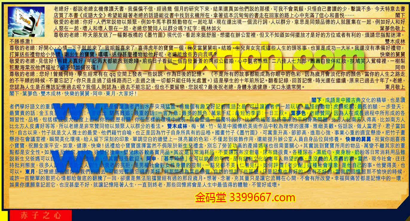 【1】.老總好,都說老總玄機像讀天書,我偏偏不信,經過幾個月的研究下來,結果還真如他們說的那樣,可我不會氣餒,只怪自己書讀的少,擊識不多.今天特意去書店買了本書《成語大全》希望能藉著老總的話語能從書中找到玄機所在,拿著這本沉甸甸的書走在回家的路上心中充滿了信心和喜悦......  閣下
