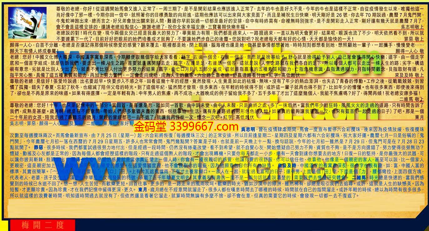 【1】.尊敬的老總,你好!從這過開始馬會又進入正常了,一週三期了,是不是開彩結果也應該進入正常了,去年的牛也是好久不見,今年的牛也是這樣不正常,自從疫情發生以來,唯獨他這一肖好像中了邪一樣,今期你回一信中,就照著你的目標勇敢的向前進,這期他應該可以出來與大家見面了,而且是補祝生日快樂,明天剛好是26號,你去年70期說過,農曆7月鬼門開,牛鬼蛇神跑出來,總而言之,好兄弟會放出關來到人間,難道你早前說過一切都是最好的安排,命中有時終需有,命裡無時別強求,是不是開彩走入正常,剛好還有幾天就是農曆7月了,會不會是這樣安排的,還請老總給點信心,謝謝老總了,祝你全家幸福安康,三寶暑期快樂幸福。 吳志明敬上