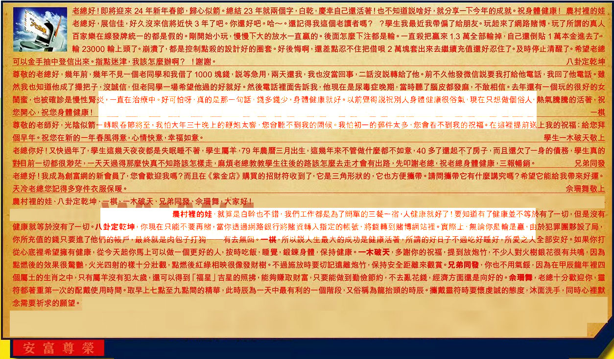 【2】.老總好,展信佳,好久沒來信將近快 3 年了吧。你還好吧。哈~。還記得我這個老讀者嗎??學生我最近我帶偏了給朋友。玩起來了網路賭博,玩了所謂的真人百家樂在線發牌統一的都是假的。剛開始小玩,慢慢下大的放水一直赢的。 後面怎麼下注都是輸。一直殺把贏來 1.3 萬全部輸掉,自己還倒貼 1 萬本金進去了。輸 23000 輸上頭了。崩溃了,都是控制點殺的設計好的圈套。好後悔啊,還差點忍不住把借唄 2 萬塊套出來去繼續充值還好忍住了。及時停止清醒了。希望老總可以金手抽中登信出來。指點迷津,我該怎麼辦啊?!謝謝。  八卦定乾坤
