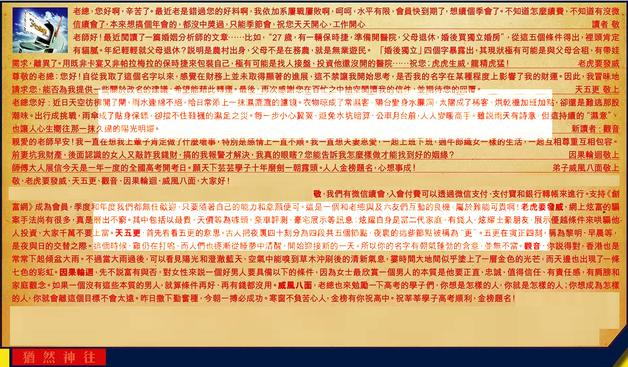 【1】.老總,您好啊,辛苦了。最近老是錯過您的好料啊,我依加系屢戰屢敗啊,呵呵,水平有限,會員快到期了,想續個季會了。不知道怎麼續費,不知道有沒微信續會了,本來想搞個年會的,都沒中獎過,只能季節會,祝您天天開心,工作開心 讀者 敬