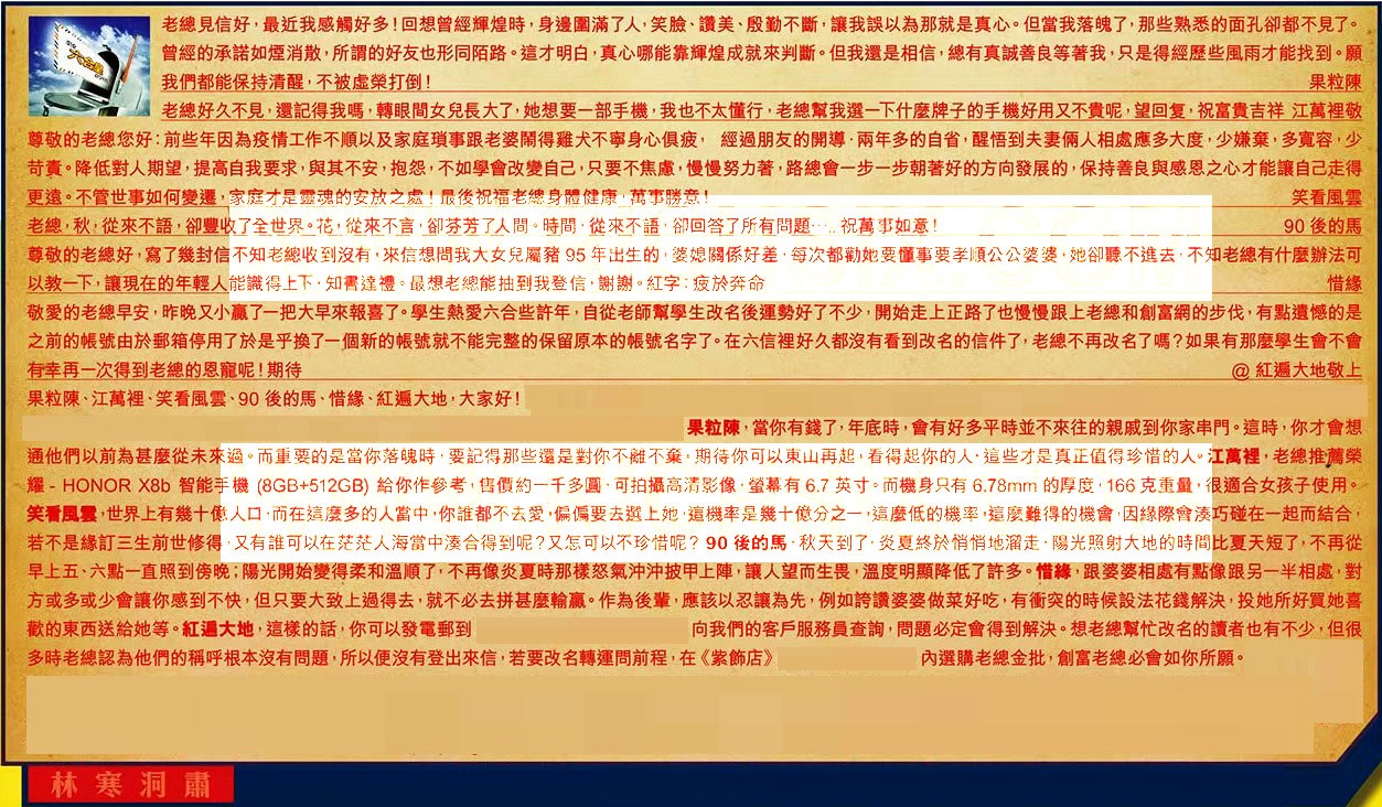 【6】.敬愛的老總早安,昨晚又小赢了一把大早來報喜了。學生熱愛六合些許年,自從老師幫學生改名後運勢好了不少,開始走上正路了也慢慢跟上老總和創富網的步伐,有點遺憾的是之前的帳號由於郵箱停用了於是乎换了一個新的帳號就不能完整的保留原本的帳號名字了。在六信裡好久都沒有看到改名的信件了,老總不再改名了嗎?如果有那麼學生會不會有幸再一次得到老總的恩寵呢!期待 @紅遍大地敬上