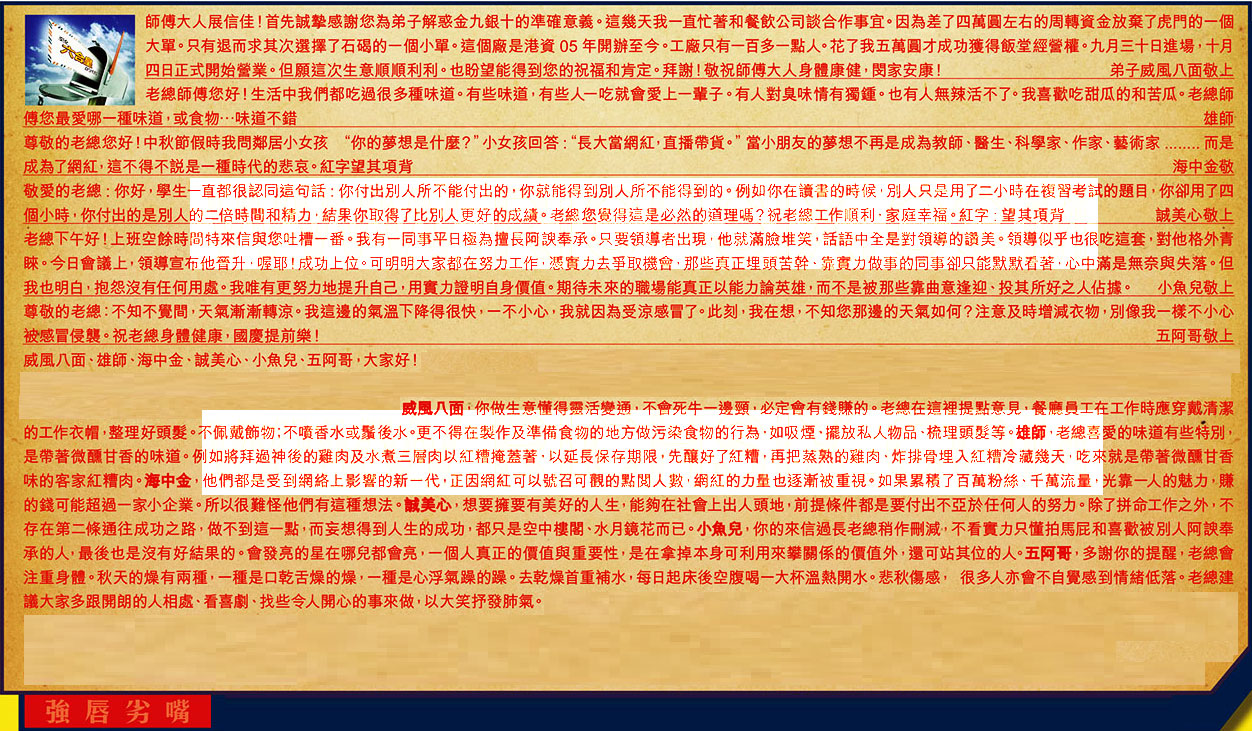 【1】.師傅大人展信佳!首先誠摯感謝您為弟子解惑金九銀十的準確意義。這幾天我一直忙著和餐飲公司談合作事宜。因為差了四萬圓左右的周轉資金放棄了虎門的一個大單。只有退而求其次選擇了石碣的一個小單。這個廠是港資 05 年開辦至今。工廠只有一百多一點人。花了我五萬圓才成功獲得飯堂經營權。九月三十日進場,十月四日正式開始營業。但願這次生意順順利利。也盼望能得到您的祝福和肯定。拜謝!敬祝師傅大人身體康健,閔家安康! 弟子威風八面敬上