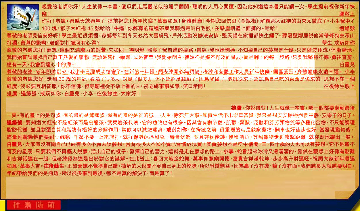 →〖小李〗:蛇看起來冰冷又滑溜溜的,雖然在觀感上好像有點難和吉祥話連在一起,但老總認為這是出於對它的誤解。在此送上:春回大地金蛇舞,萬事如意樂開懷,富貴吉祥滿乾坤,步步高升財運旺。祝願大家新年順遂如意、萬事大吉。