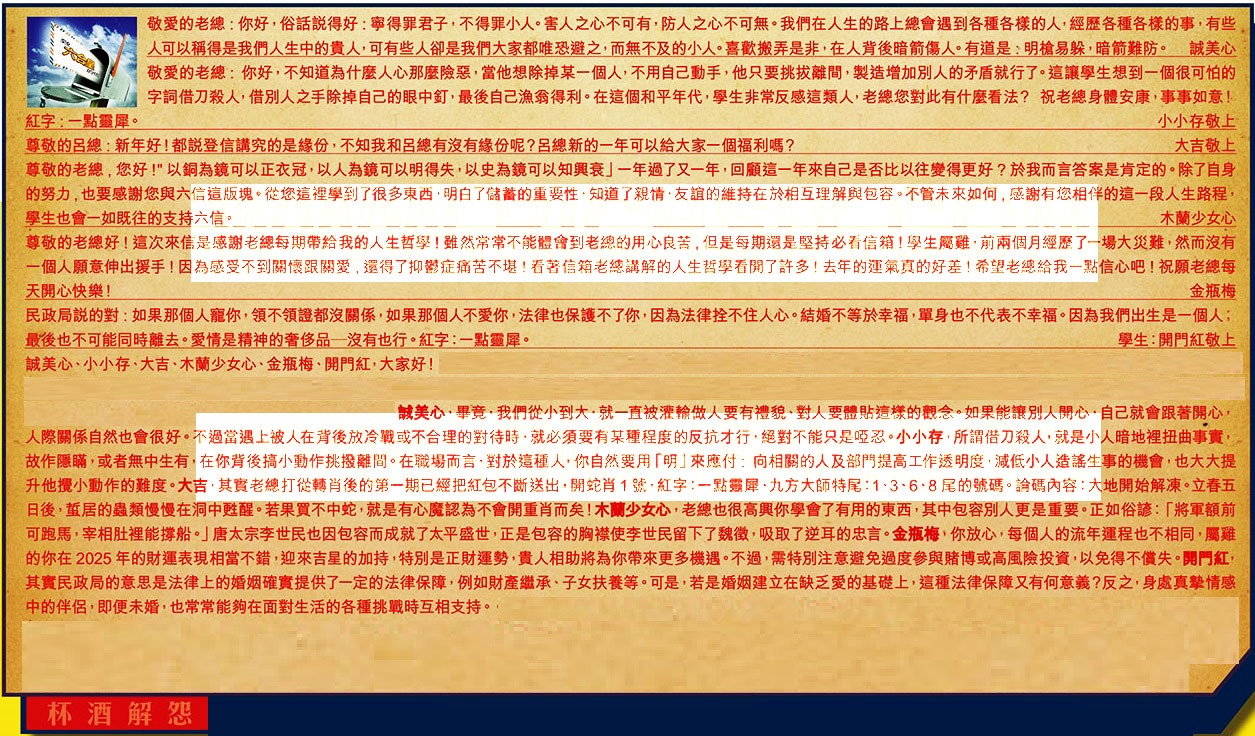 【5】.尊敬的老總好!這次來信是感謝老總每期帶給我的人生哲學!雖然常常不能體會到老總的用心良苦,但是每期還是堅持必看信箱學生屬雞,前兩個月經歷了一場大災難,然而沒有一個人願意伸出援手!因為感受不到關懷跟關愛,還得了抑鬱症痛苦不堪!看著信箱老總講解的人生哲學看開了許多!去年的運氣真的好差!希望老總給我一點信心吧!祝願老總每天開心快樂! 金瓶梅