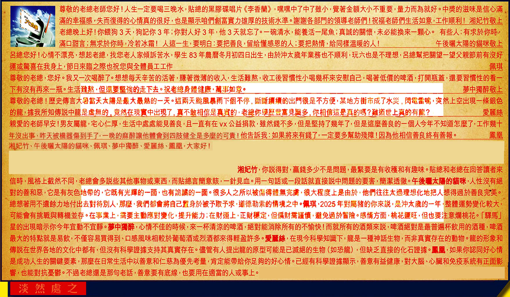 →〖湘妃竹〗:你說得對,贏錢多少不是問題,最緊要是有收穫和有趣味。貼總和老總在回答讀者來信時,風格上截然不同,老總會多說些其他事物或東西,而貼總言簡意賅,一針見血。用一句話或一段話就直接說中問題的要害,簡潔透徹。