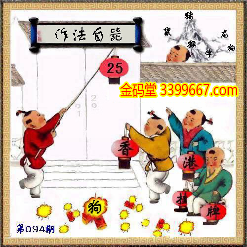 094期正版彩图挂:25爆:狗 挂牌成语:作法自毙 挂牌出肖:鼠猴牛猪龙狗