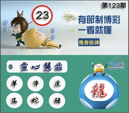123期正版彩图挂:23 爆:龙 挂牌成语:灵心慧齿 挂牌出肖:羊牛虎马蛇猪