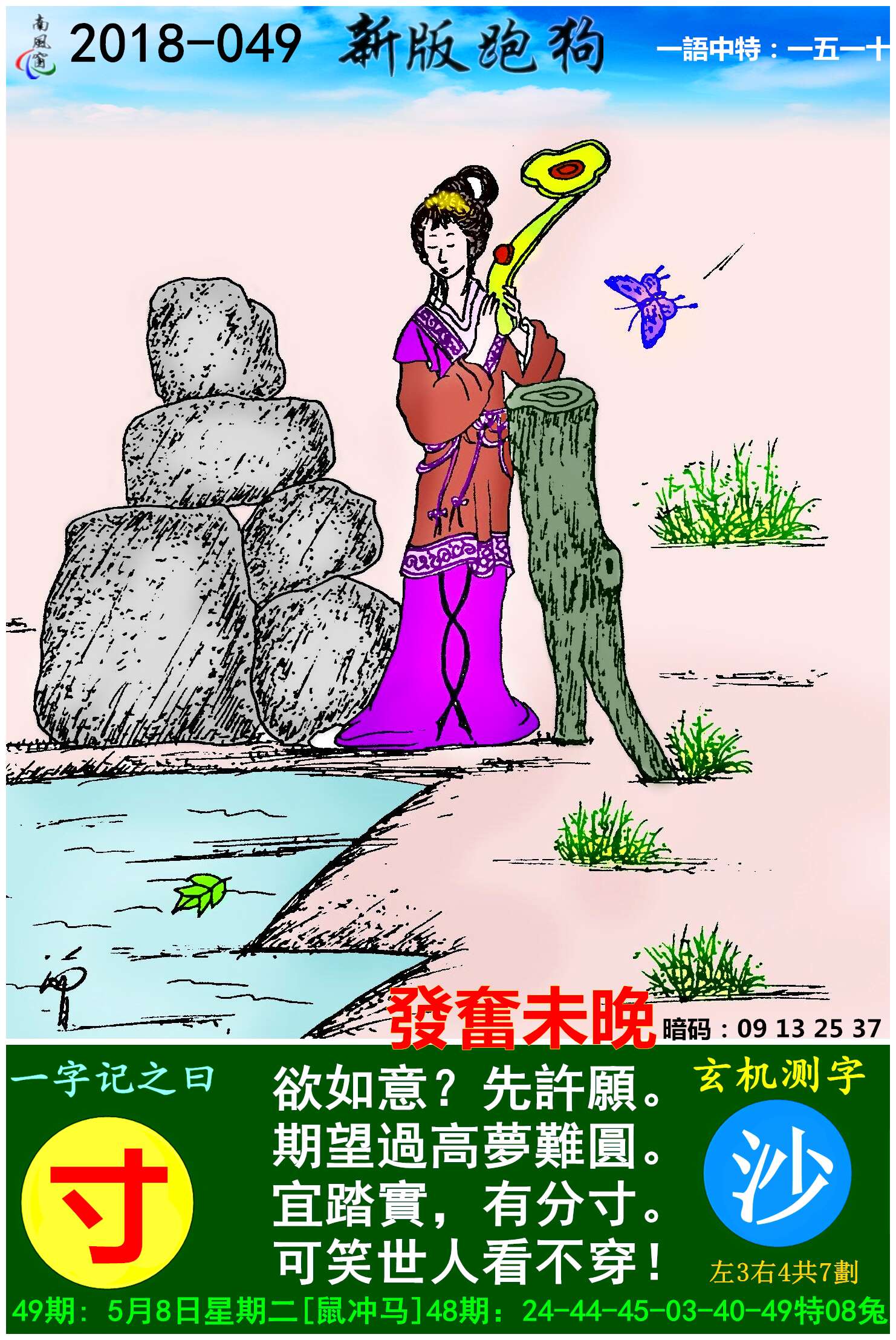 分析:欲如意?先許願。期望過高夢難圓。想要称心如意,先许愿,给自己定个目标,然后朝着这个目标前进。许愿、确定目标也不是说随便乱来的,要有个度,把目标定得太高,难实现,无形中也自己增添很多压力。宜踏實,有分寸。可笑世人看不穿!因此说还是要脚踏实地的,定目标也要有方寸,根据自己能力来,不能急(鸡)功近利,急(鸡)于求成!其实这么简单的道理,为什么那么多人看不穿呢,简单说来就是很多人都急功近利,急于求成造成的。以至于麻痹了自己。