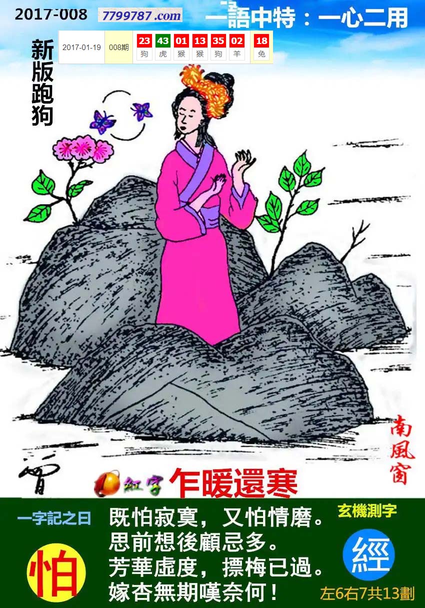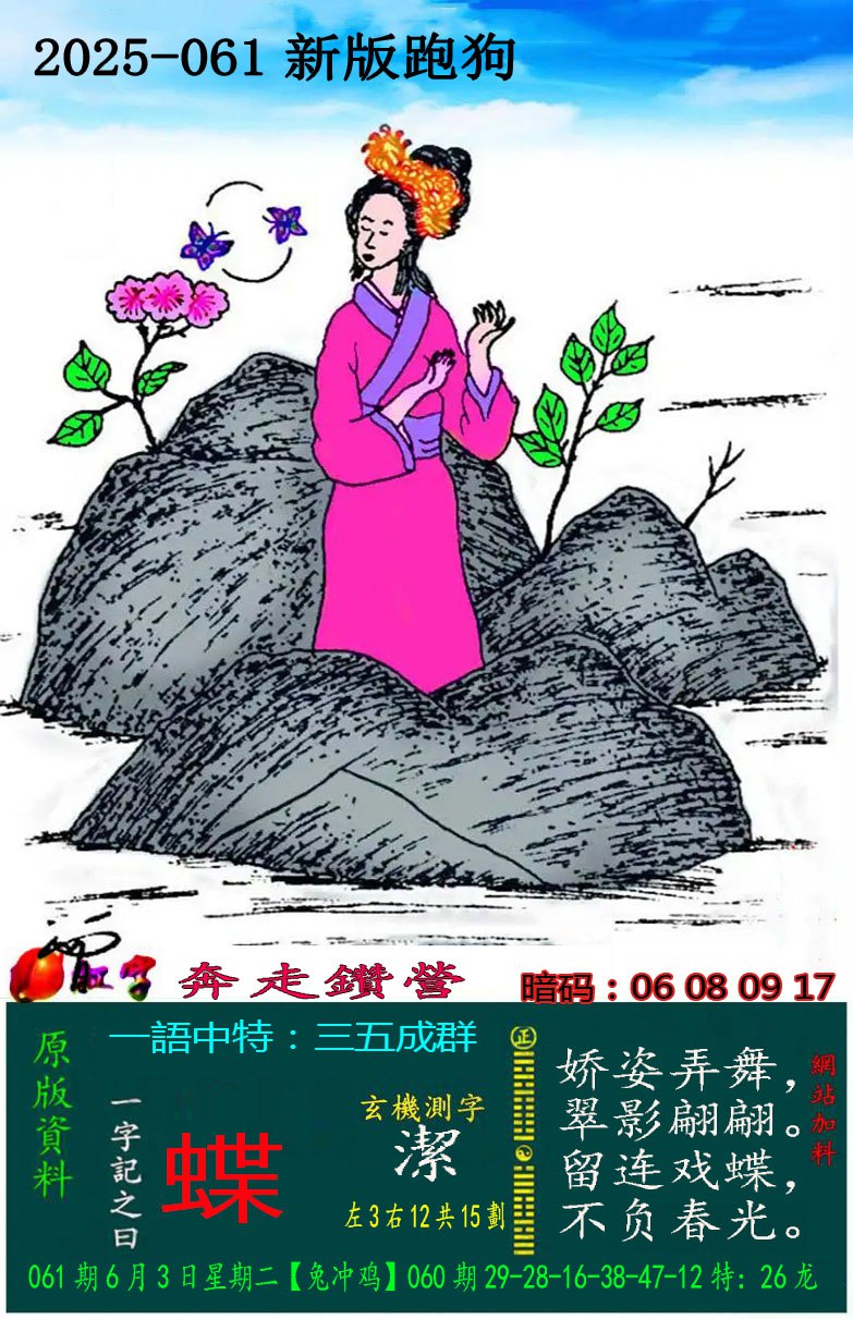 061期:新版跑狗一字記之曰【蝶】 玄機測字:【潔】