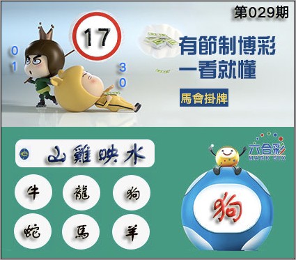 029期正版彩图挂:17 爆:狗 挂牌成语:山鸡映水 挂牌出肖:牛龙狗蛇马羊